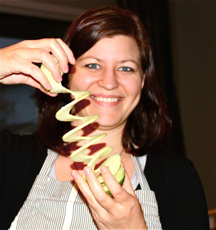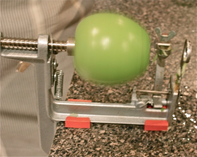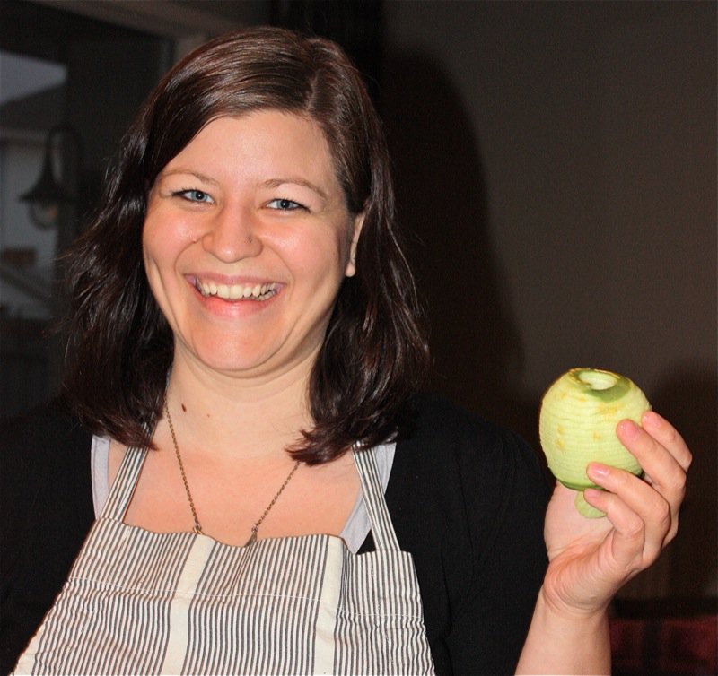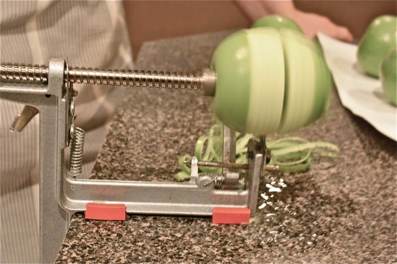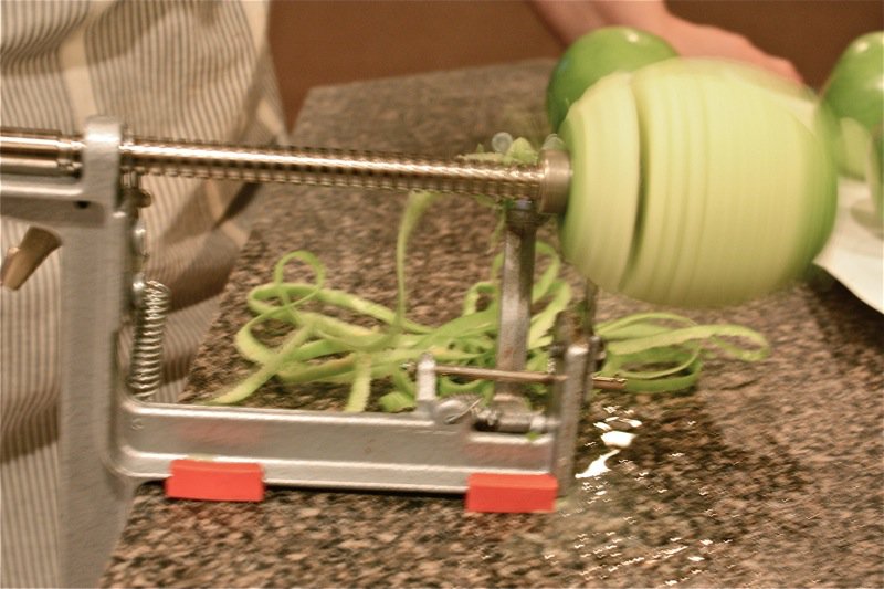 Christan arrived ready to bake: apron, knives, and miracle apple pie making tool… her apple slicer-peeler! I have seen these everywhere, but was not smitten. Contrary to what some may think (due to my consistent proclamation of undying love for my Thermomix) I am not a huge gadget person. I have effortlessly resisted buying myself one of these. How silly! I can peel an apple in 30 seconds. It takes me 5 minutes to peel 5 apples for a pie. Why would I ever want one of these.