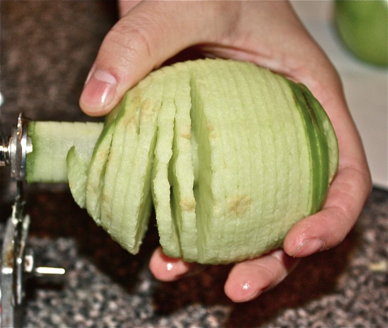 I have one of those apple slicer/peeler machines!! We used to have one at our primary school (we called the machine an apple slinky machine) and it was like….the coolest thing ever to little primary school kids =) We’d all buy apples from the canteen or bring our own apples to be ‘slinkied’ (for 50cents…haha) And eventually almost every family in the school had one of these machines. We found that it cut a lot of the apple flesh off too so we donn’t actually use it that often….just for fun once in a while.
