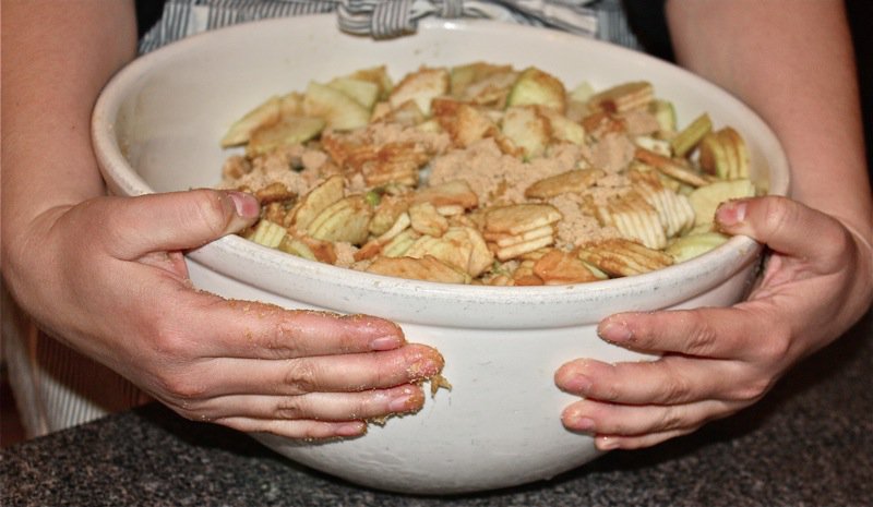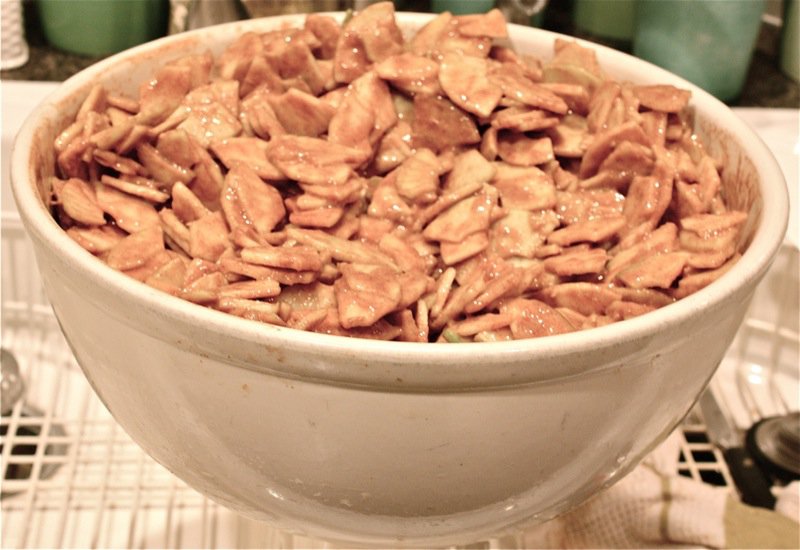 I cut my apples directly into the pie after dusting the bottoms with a sprinkle of sugar to keep the bottom crust crisp. The sugar and flour are sprinkled on top of each and tossed in, right inside of the pie shell. I usually only make two or three pies at once. Christan makes a lot. Every time.