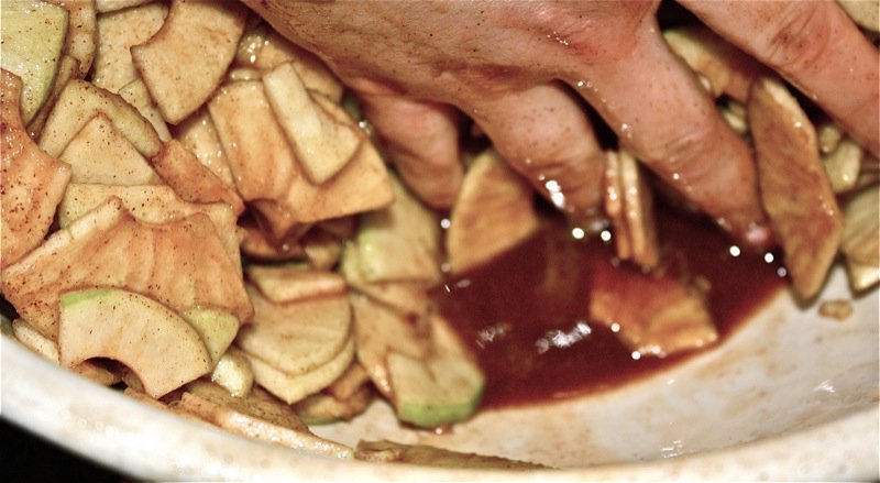 “These apples are really juicy!” How can you tell? “I can feel it! Look!” I was very surprised by the amount of liquid in the bottom of that bowl already. Well, I was very surprised by her entire process. I make mine completely differently.