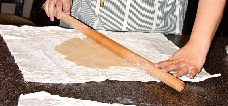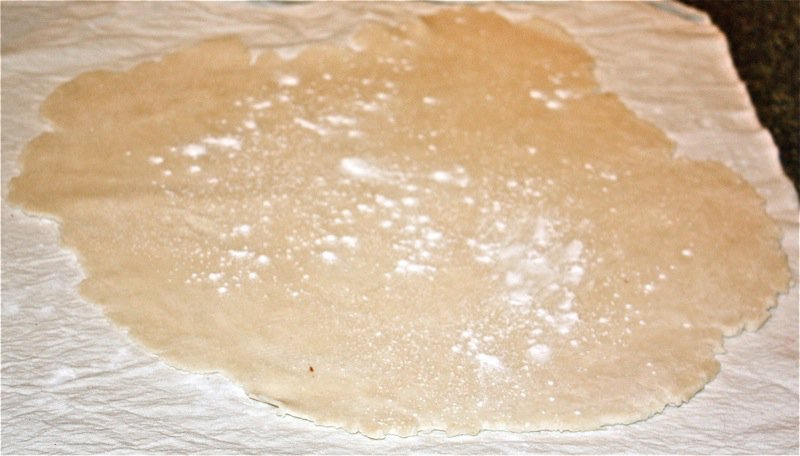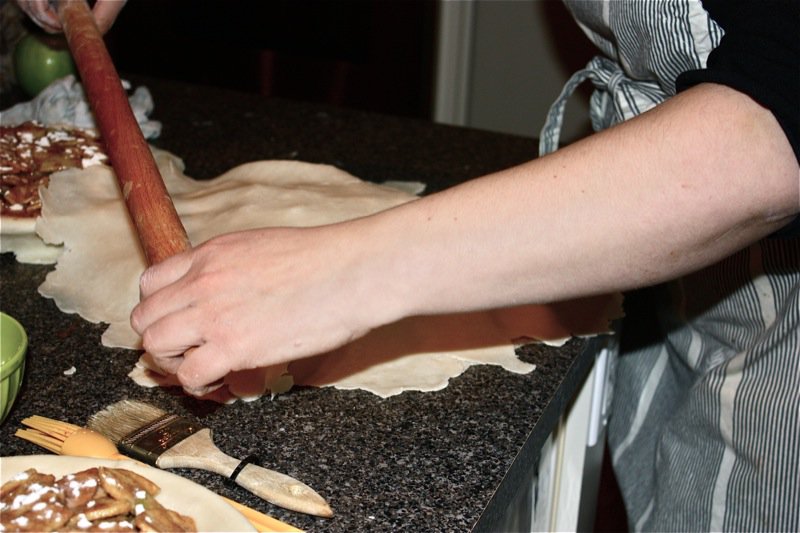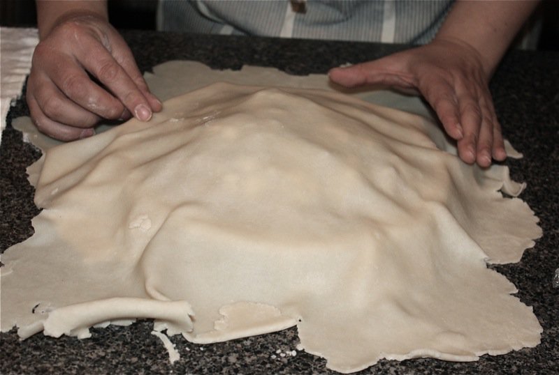 She forgot her rolling pin, and I only had one decent one. (It is not the one above.) We shared, rolling out each chilled disc to 1/4 inch thick, keeping a good dusting of flour (but not too much) under the pastry so it would life off the cloth easily.