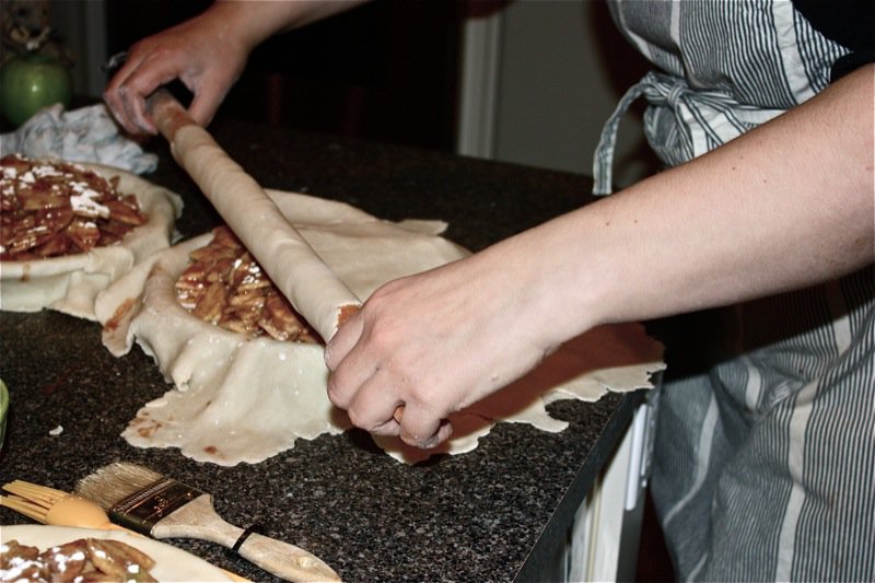 After a little discussion about how I made the pastries, we sniffed them, and then got rolling. I always use a pastry cloth and a sleeve on my pastries and my shortbread. It is just easier for me. She usually uses brown paper from bags. Makes sense, too.
