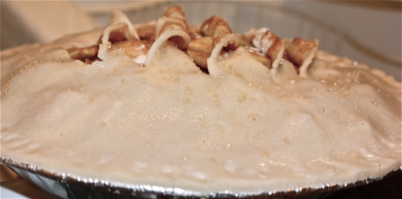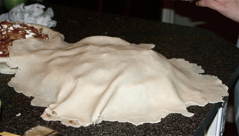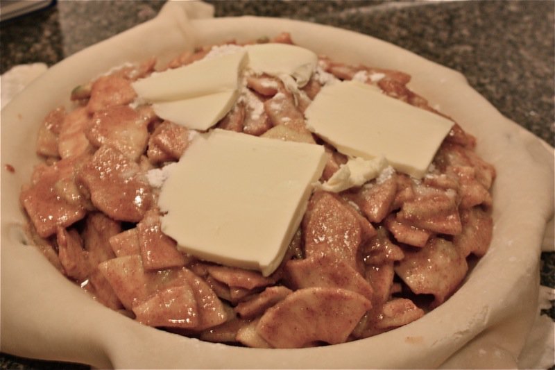 Beavie was out with it as soon as we finished crimping the first pie: we had forgotten to add the butter! Yikes! The Tenderflake pie had no butter added. Oh, well. At least it was the only one! Actually, I think Christan’s pie missed the butter, too! So, this is how I add the butter: six teaspoons or so under the top shell. This is also how I sometimes move the top pastry over tot he pie. Usually I roll out both discs and use the best one for the top. Doing it this way, that is not an option. Lucky for us that all the pastry was really nice.