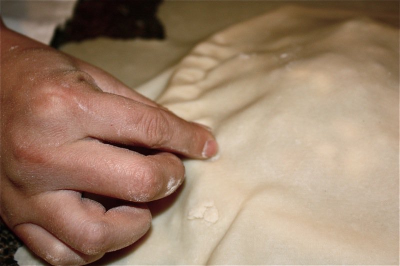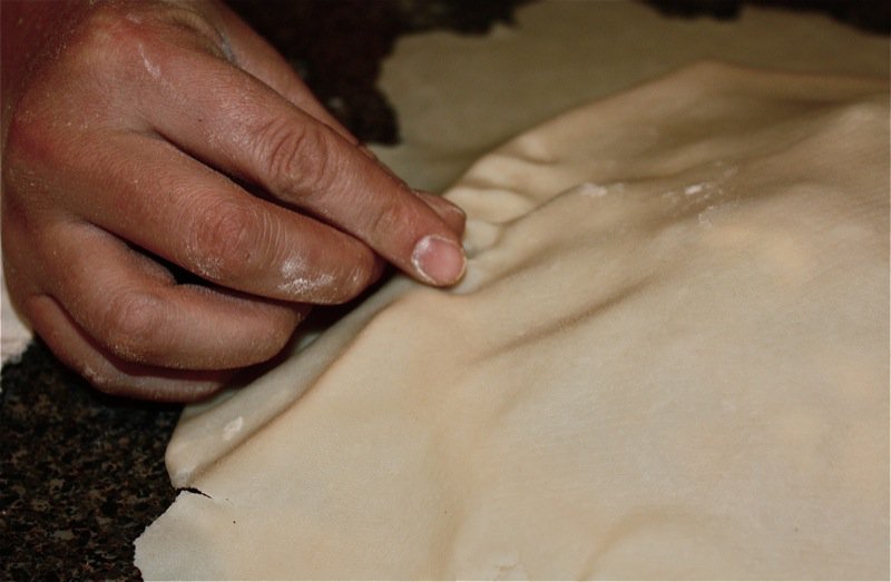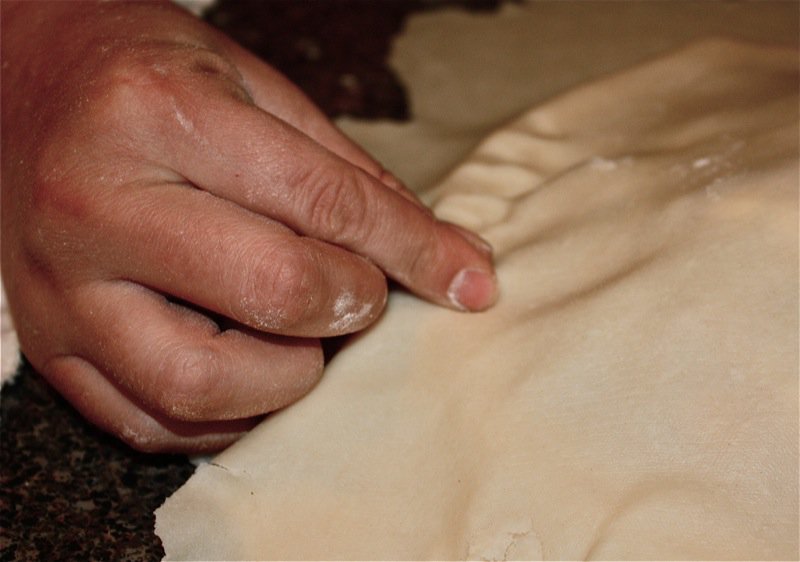 She actually doesn’t cut her overlapping pastry until she has completely finished her gentle crimping. See how she does that below? Above her crimping, I do cut off the extra overlapping and discard it, then fold up the extra to make a more pronounced decorative pinched crimp.