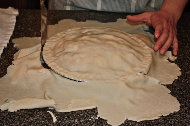 Christan also crimps very differently than I do. She brushes the bottom pastry with water, lays over the top (Here she rolled the pastry onto her rolling pin and unrolled it over the pie which is the second method I use, too), and then she starts crimping. The water glues both sheets together.