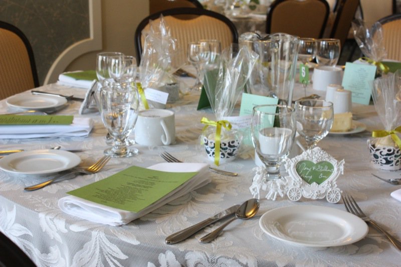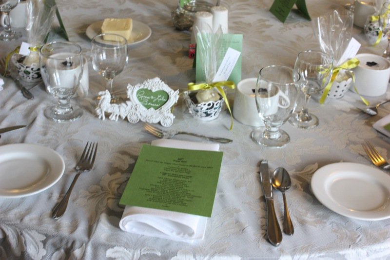 Isn’t this a pretty table? The party room in mom and dad’s new condo was the perfect venue for our event. I have been doing wedding shopping, too, so found these sweet little Cinderella horse and buggy picture frames that we used as name cards and hid a picture of mom and dad behind for a take home gift. The “Thank you” cupcakes also served as a little extra table dressing as did the colourful menus.