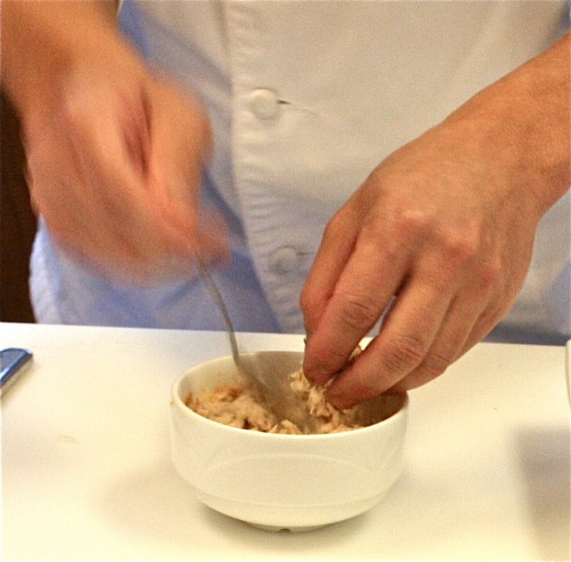The spicy mayo went onto the plate and then he plated his rolls. What is in the bowl? Crab!