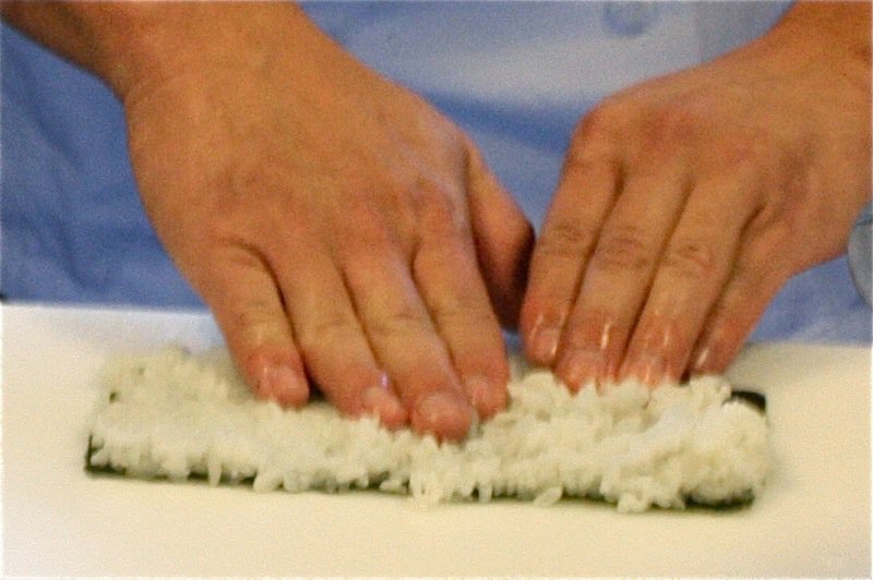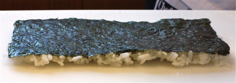 Place it across the top of the rough side of the nori (smooth side down) and gently move the rice down across the nori: to not pull it or press it.