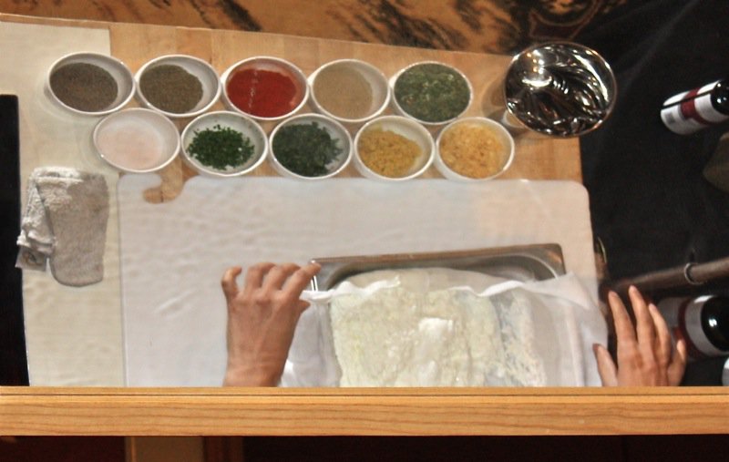 Above she is pouring the milk onto the strainer lined with cheese cloth. Below, she moves it into a block shape and wraps it up.