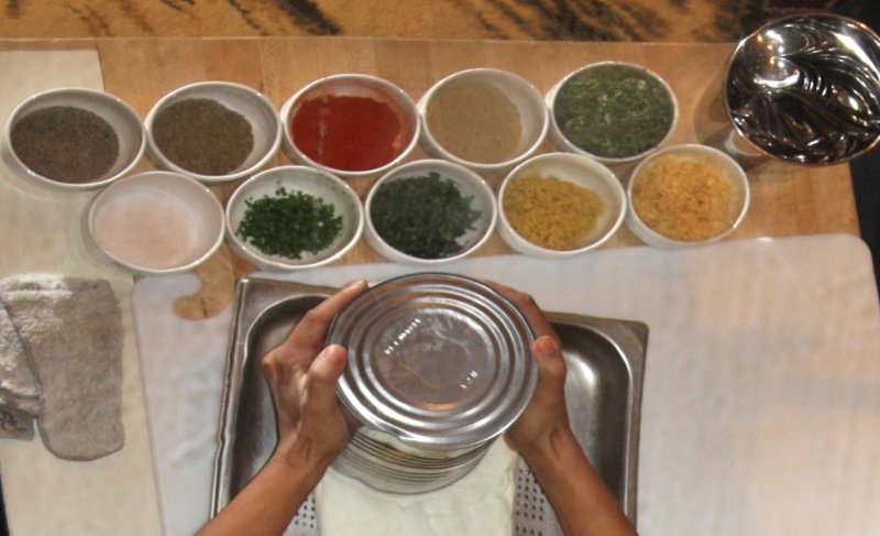 Bal places a heavy can on top of her paneer to squeeze all of the whey out of it.