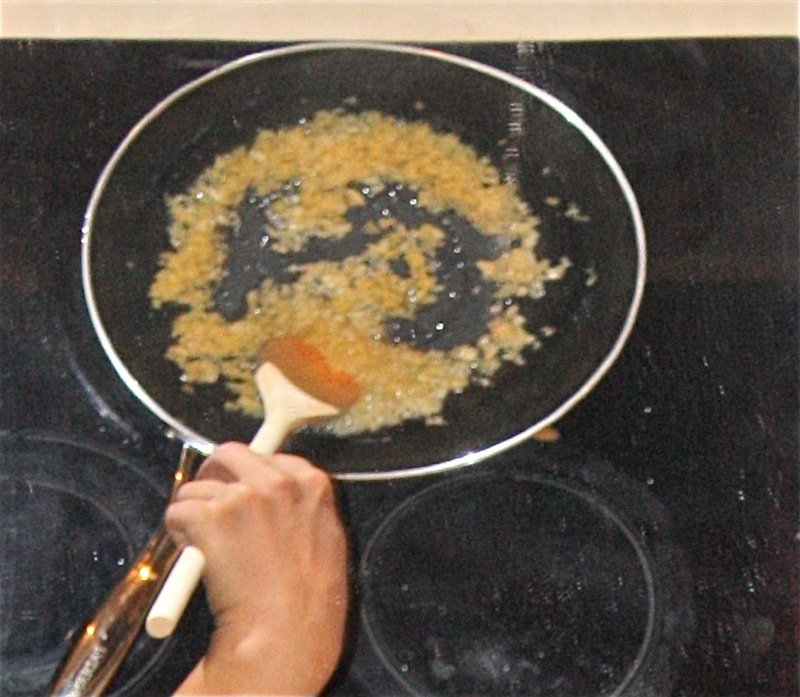- Place the oil, onion, garlic and ginger in the frying pan over medium high heat and cook for three minutes; move aside and add cumin seeds to toast for one minute