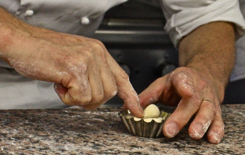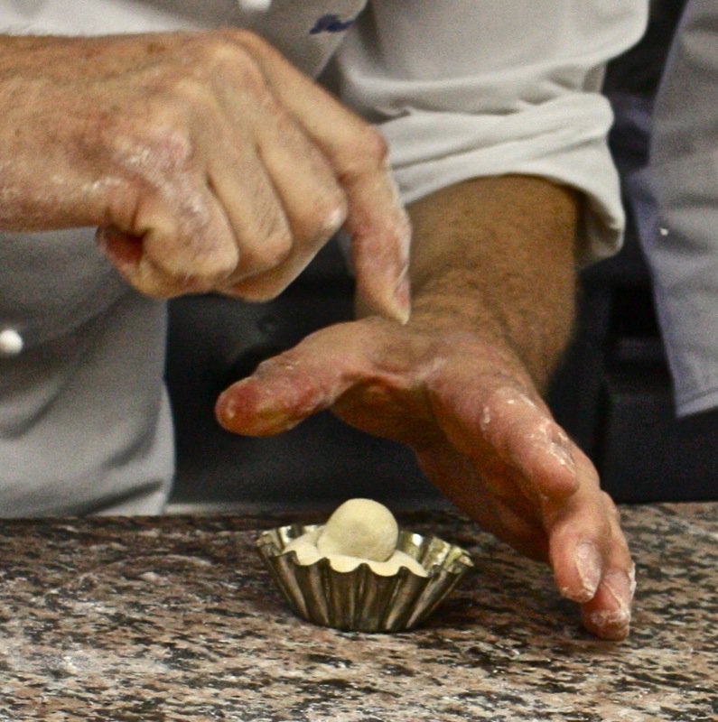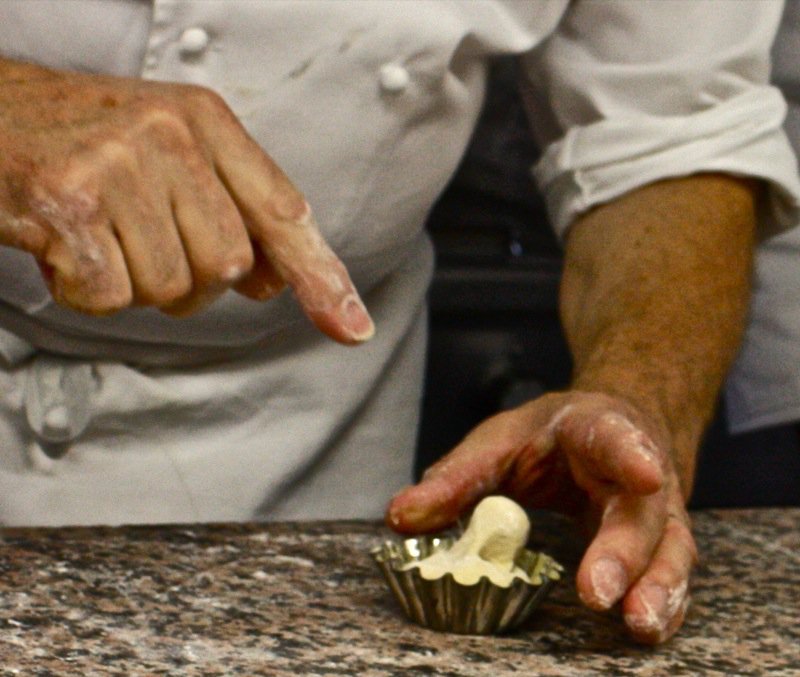 You can see how Chef Walters uses his baby finger to etch out about 1/4 to 1/3 of the dough ball. Then, continuing to use the side of his hand with gently and even pressure, he forms what looks like a bowling pin. He did it over and over exactly the same way.