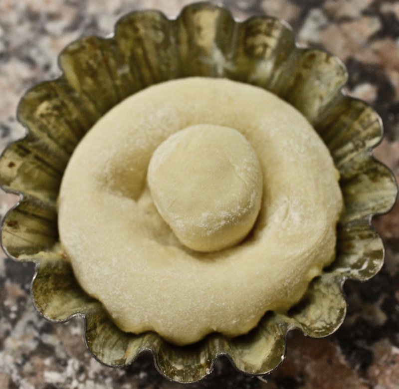 But, before we had at it, he showed us how to tuck in the head to get it to stand up straight. You can see above that he has plopped the dough into the form and then uses his forefinger to nestle the head into the ball, upright.