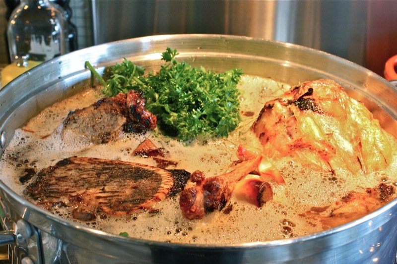 The next morning, I had fat to remove from the top of the pot. Once I did, however, I could see there was so much more goodness left on the bones, so I took another liberty added to a good dose of common sense after warming up the gelatin enough to strain it off. I then filled the pot up with water again, and simmered it another four hours. Telling Kevin about this, he told me that the French term for this is “remouillage” from the verb mouillir meaning ‘to wet’. I must have been on to something. My stock pot was way to small and these bones filled with incredible goodness, as I did this three times in total.