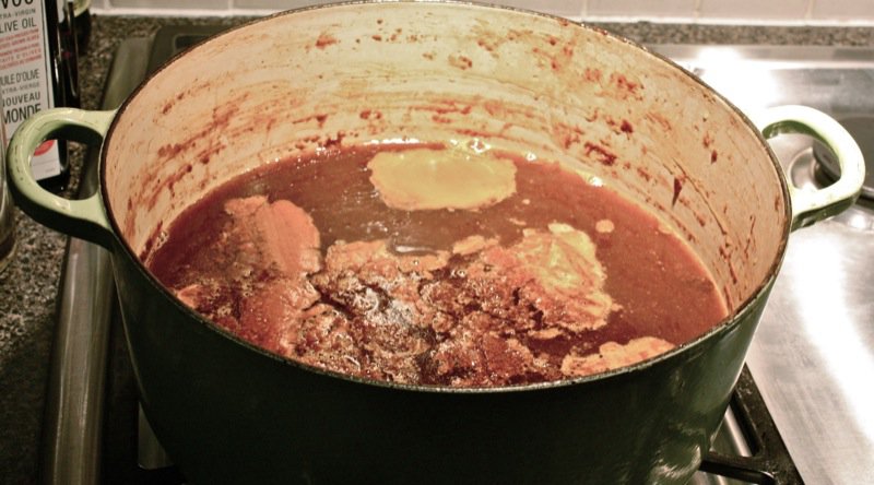I am comparing the colours of both stocks, below. The darker one is from the first three “remouillages” and the lighter one from the last. It was still exceedingly flavourful, so I was definitely going to add it to the mix.