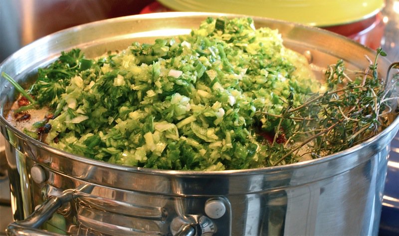 I assumed the minuscule dice was to let as much flavour in each aromatic out as possible. The leeks and time went in.