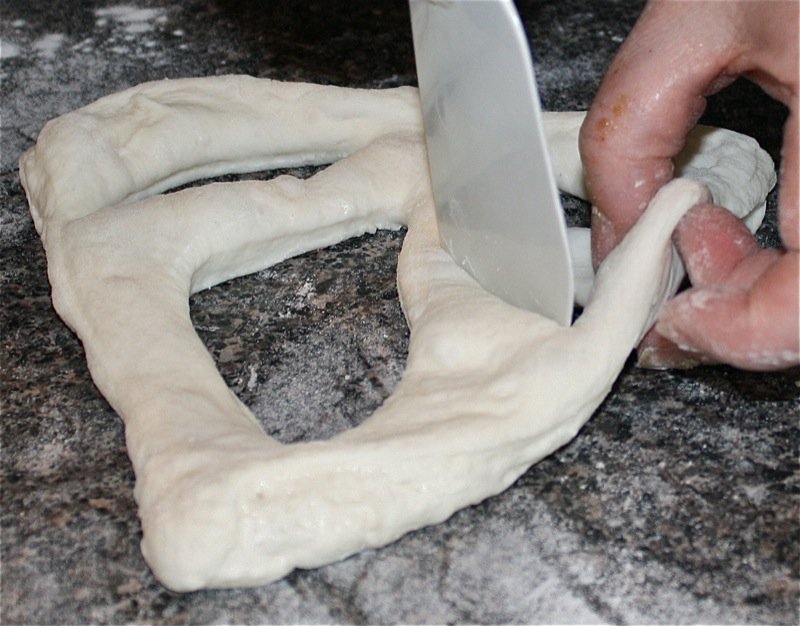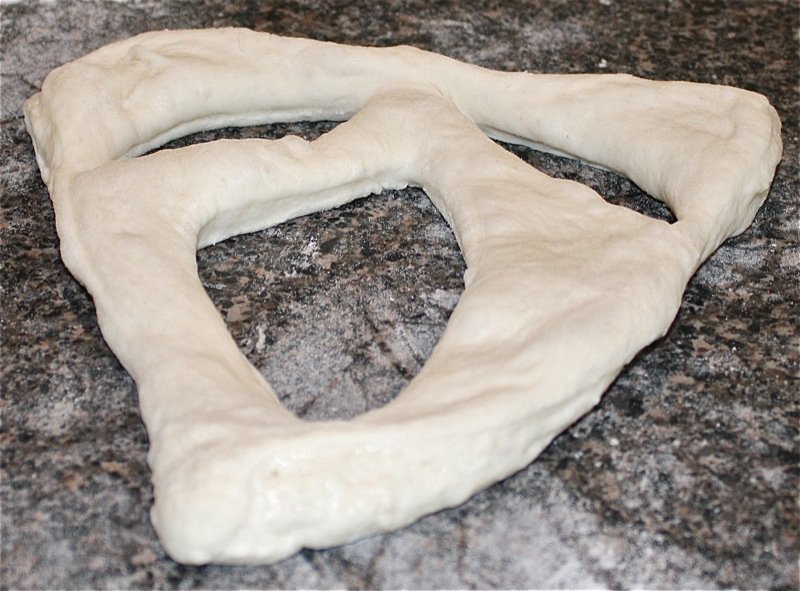 - Gently release dough from the bowl and stretch into a rectangle (about 25 cm long); roll in rice flour and twist randomly to form the shape (we sprinkled the olives on at the rectangle stage, folded the dough over them in thirds, and then twisted to form the shape)