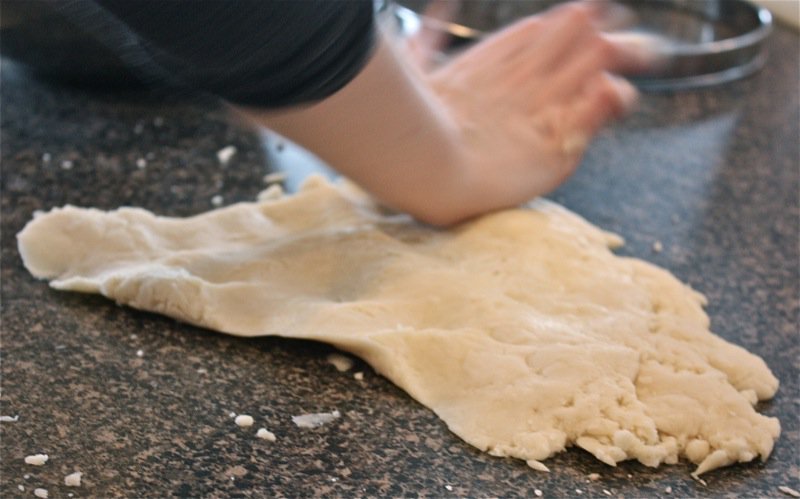 Above, Béné uses the age old method of mixing the Pâte Brisée with her finger as generations of French woman have done before her as she combines all ingredients: once it forms a soft ball, engage in the “fraiser” (countersinking) method demonstrated in the photos, below 3 or 4 times, until the dough is homogenous (with attention not to overwork it).