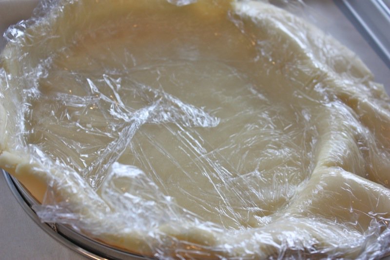 - Poke holes in the dough, line the crust with plastic wrap and fill it with beans or rice to keep the bottom from puffing and the sides from falling