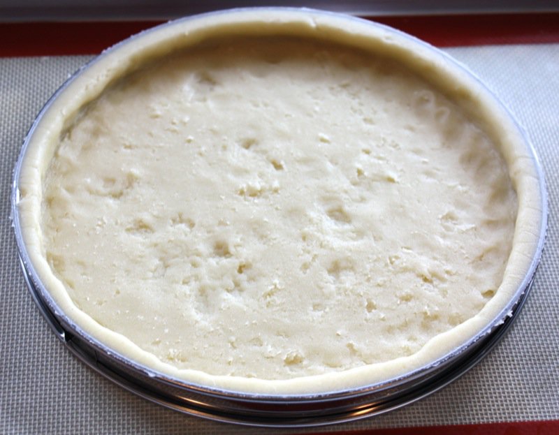 Before it is baked, several fork holes are punched in the bottom of the pastry and the plastic wrap is left inside of it, filled to the top of the ring with rice, and par baked to ensure the sides of the crust do not shrink.