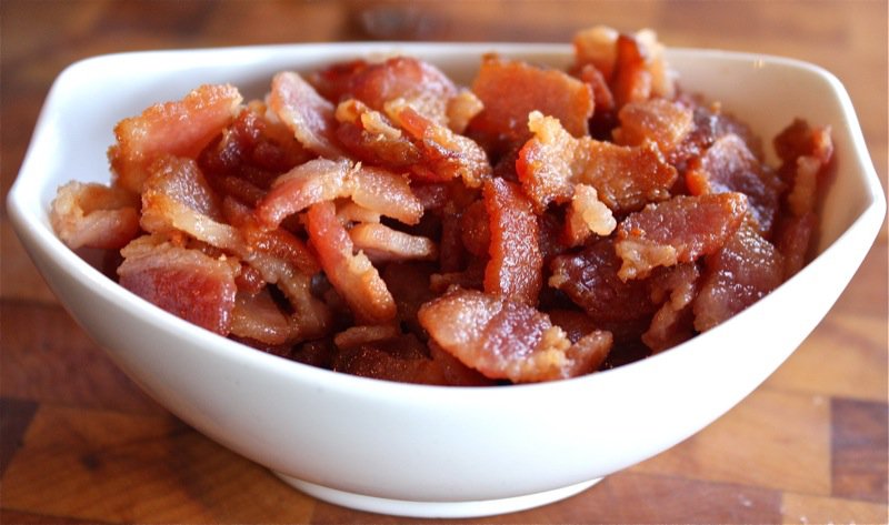 - While the dough is in the refrigerator, fry the lardons until almost crisp; remove from the pan and drain