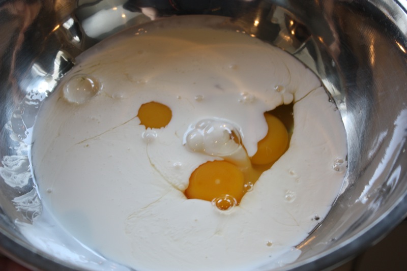 - Beat eggs, milk, and cream together with the salt, nutmeg and pepper