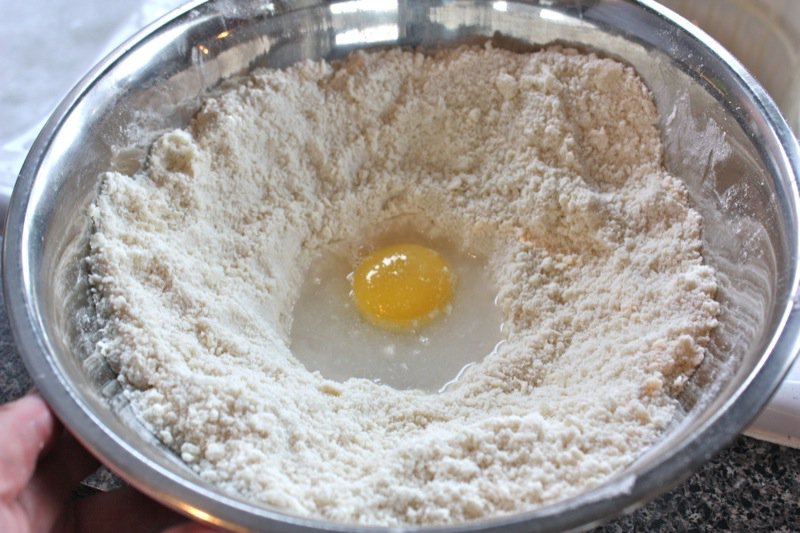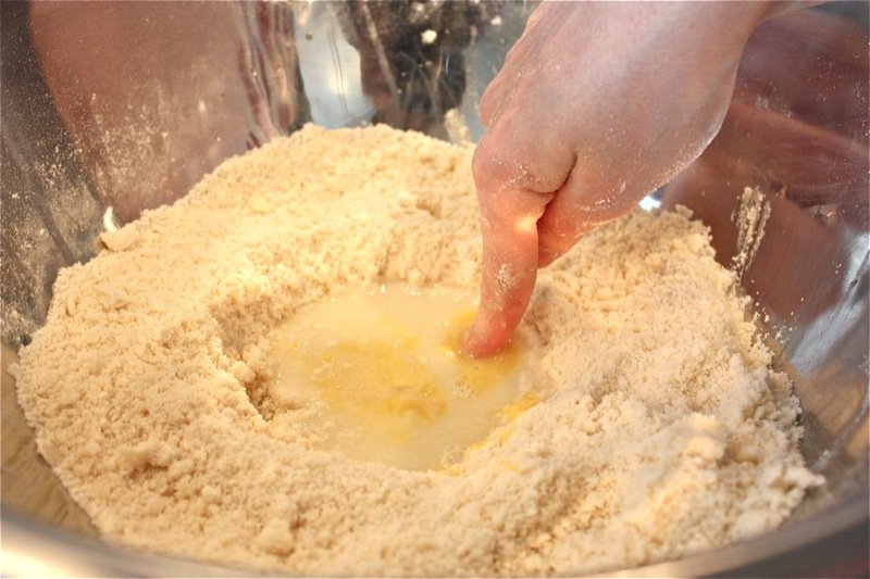 - Create a well and pour the egg yolk and the water and combine all ingredients using your finger