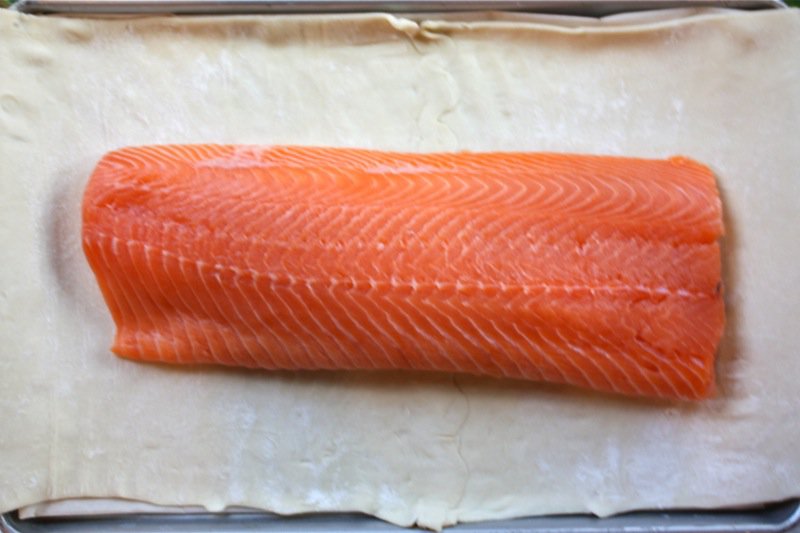 - Lay the puff on a damp baking sheet with the long edge facing you; place the salmon on the pastry; season with salt and pepper