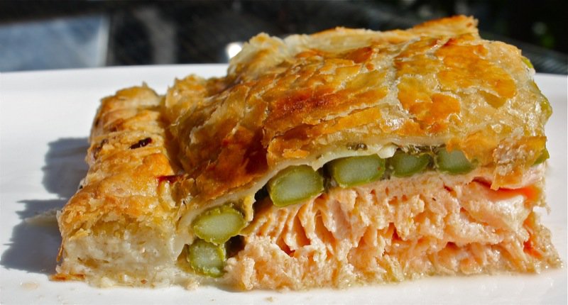 - Brush the margins of the bottom puff surrounding the fish with the egg wash; lay the top pastry over the salmon and press the edges close to the salmon to seal, pushing the asparagus snuggly in place close to the salmon