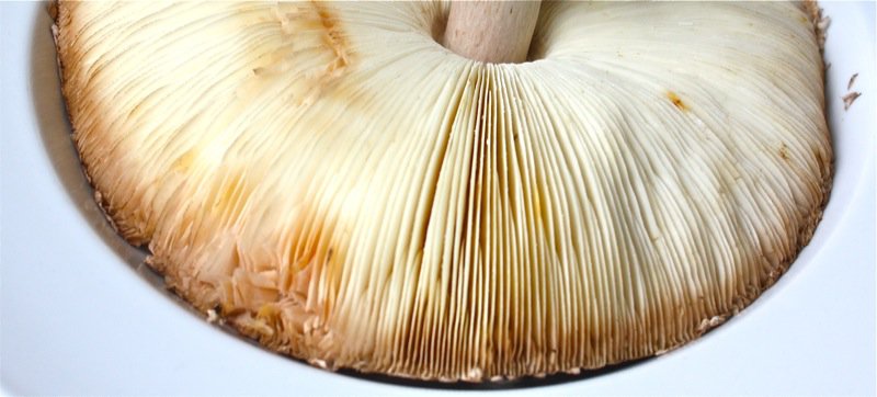 Look at the size of that mushroom! The aroma of the stem is deep and earthy and filled with saliva inducing umami notes. The underside of the cap is very fresh and almost odorless. What a beautiful work of nature. What an incredible gift! The first of this year’s crop from Kevin Kossowan’s yard. He is so fortunate to have a patch of these that reappear yearly, and that he nurtures, as he knows the value of what others may see as an annoyance and a garden invader.