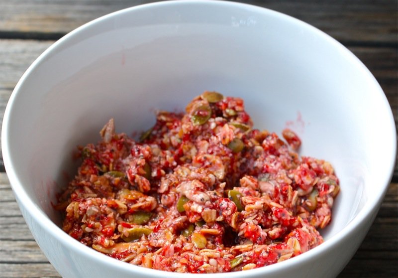 (A black fruit if in season (blue berry, blackberry, Saskatoon) for visual appeal, as well)