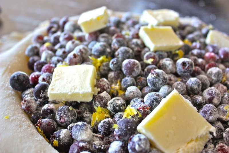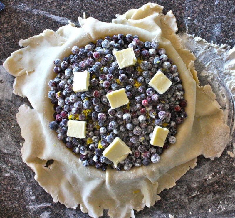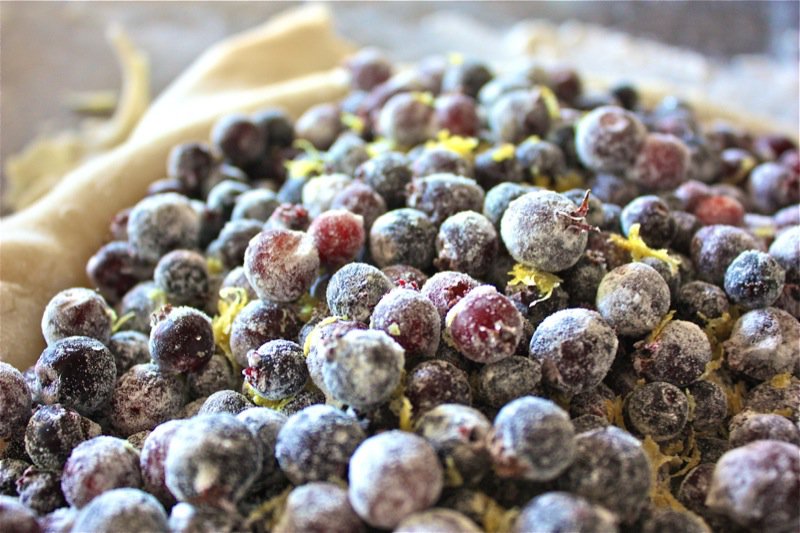 I find frozen berries make a gorgeous pie. Honestly, unless I do a side by side tasting with a fresh berry pie and a frozen berry pie, I believe there is no difference. I freeze my berries on a parchment layered cookie sheet, single layer, overnight and then store them in labelled zip-lock bags ready for pies and jams! I added 1/2 cup of sugar and a couple of tablespoons of flour to the bowl with the berries and then zested one lemon to brighten the flavour.