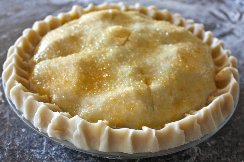 - Roll our the top crust, cover, crimp and brush with egg; sprinkle sugar on top, and vent