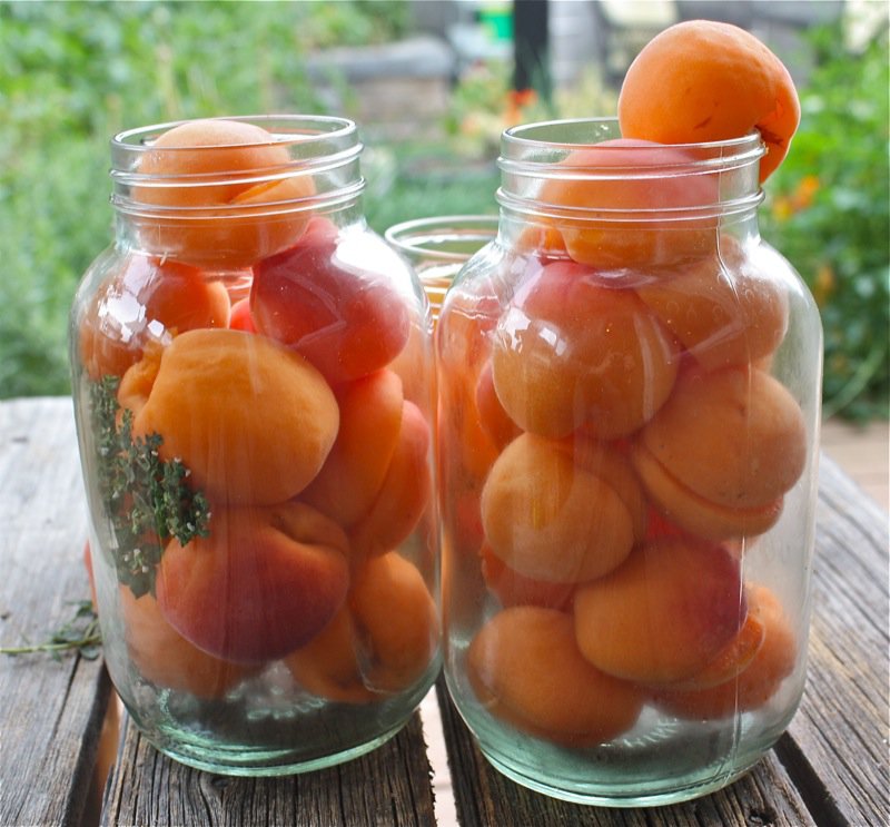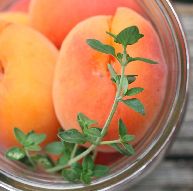 - Place a sprig of lovely thyme into each jar and fill with apricots as snug as possible, without squishing them