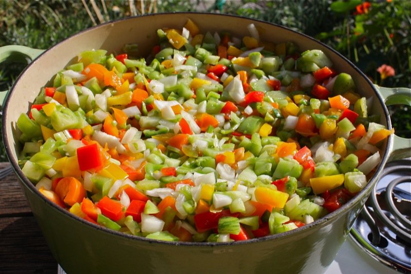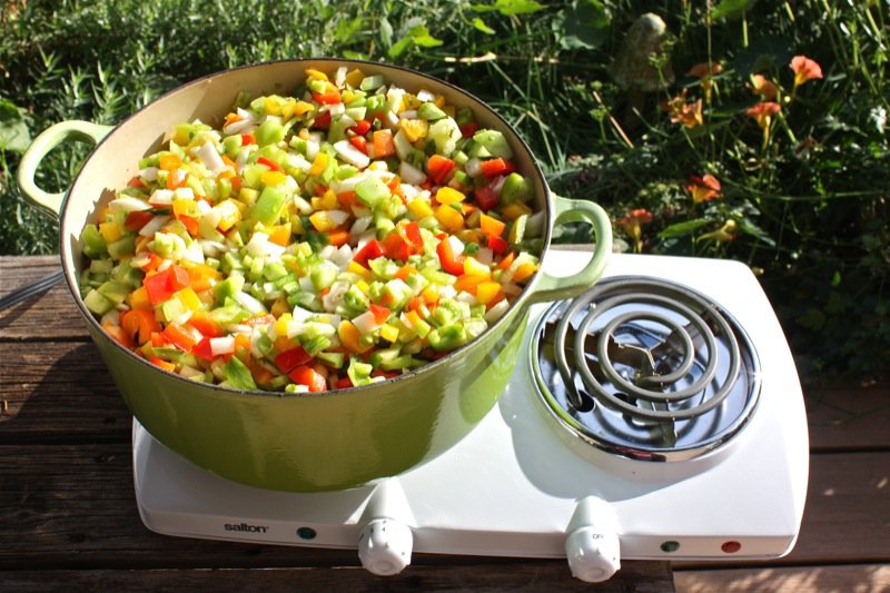 Look at that fall treasure chest of garden jeweltones below! Oh, my! The aroma was just as intoxicating as the colour. I decided that I had better do this batch outdoors as the kitchen could not take another round of abuse.