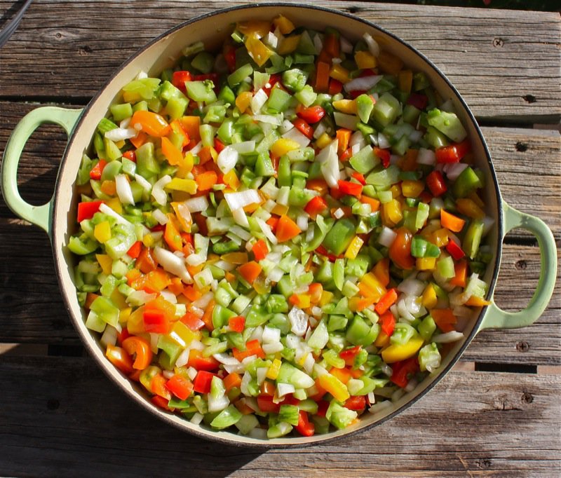“Make Green Tomato Chow!” she twirped back! What in the world is that? Of course I had to investigate. There are as many versions for green tomato chow – or chow chow – as there are for chocolate cake. Hundreds. Thousands. I had a lot of green tomatoes. I decided to make two kinds: Karlyn’s and Emeril’s. This one is Emeril’s, kind of. Better than his: healthier. Much less sugar.