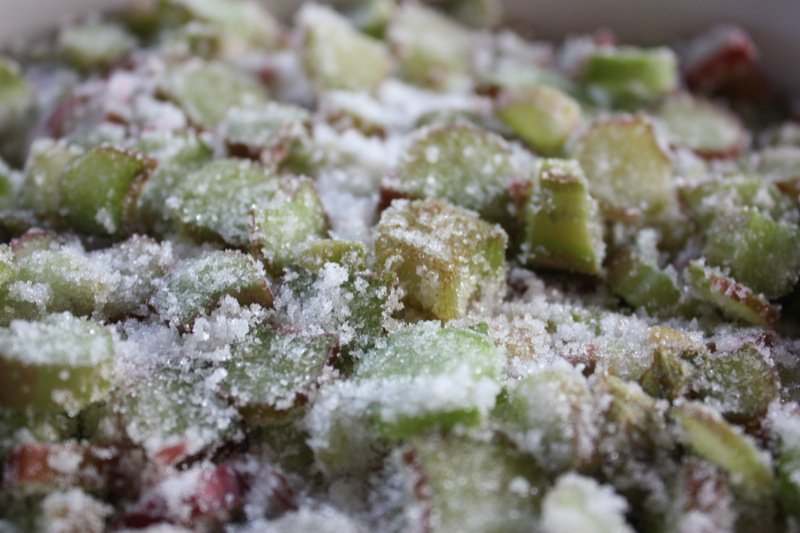 I was actually going to make a rhubarb crisp, and covered the sliced stalked with sugar and set it in the fridge until later. Later never came. Well, it came – but, waaay later! A week later, at least.