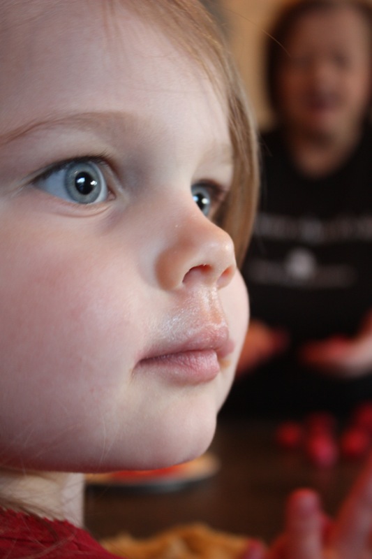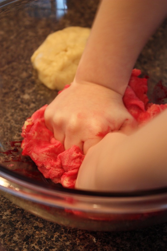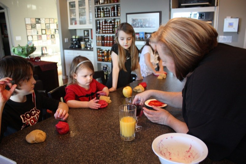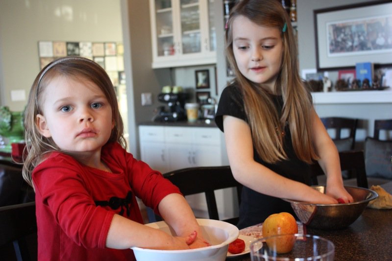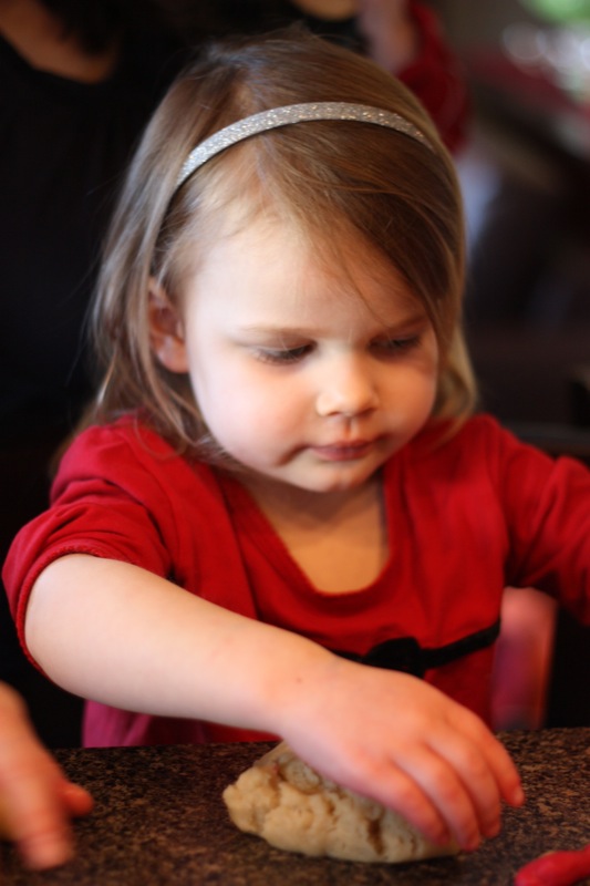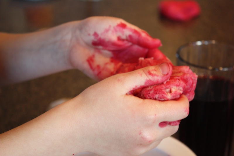 So cute! I love the looks on their faces and those little hands all red with food color 🙂 How wonderful that you took the time to bake with the little ones and thanks for the mention, Valerie!