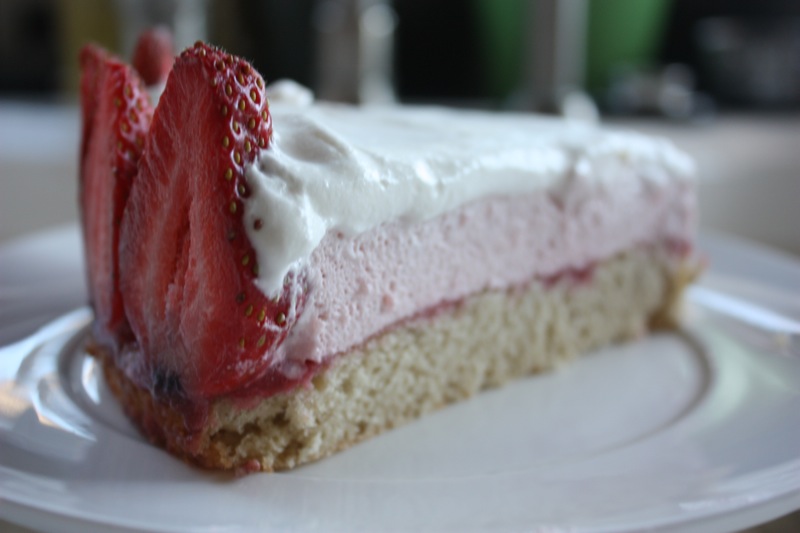 To intensify the strawberry flavor of the dessert and to moisten the sponge cake, strawberry puree is spread over the sponge cake before adding the cut strawberries and cream. Also, make sure to use strawberries of equal size to line the pan so you have a uniform look.