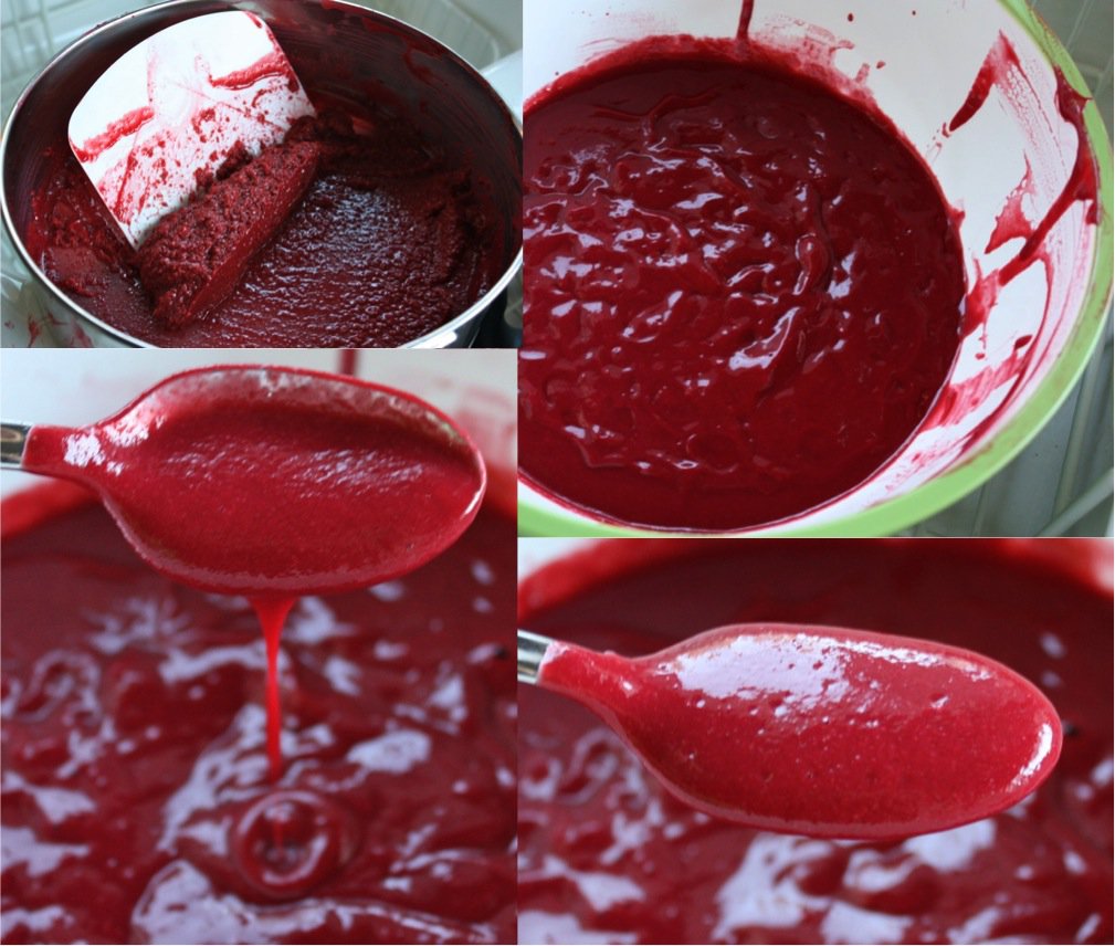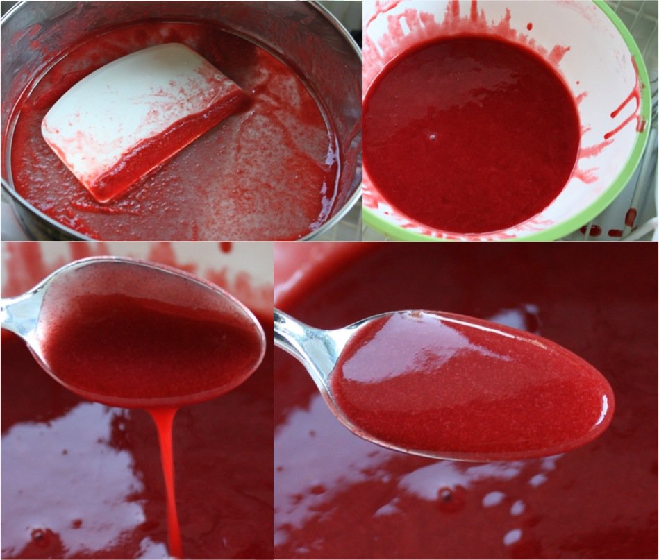 Now for the strawberry. Isn’t the difference in red colours mezmerizing. I adore the bluish hue in the raspberry and the orange warmth in the strawberry. Can you see how much thinner the strawberry coulis is?