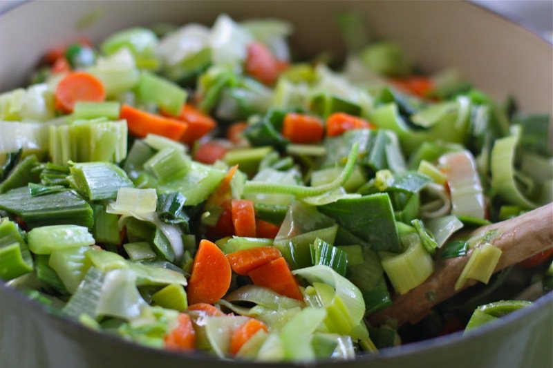 - Cook leeks, carrots, celery, and garlic in oil with herb sprigs, bay leaf, cloves, and 1/2teaspoon each of salt and pepper in a large heavy pot over medium heat, stirring occasionally, until softened and golden (about 20 minutes: my pan is huge and this huge batch does fit if added in stages)