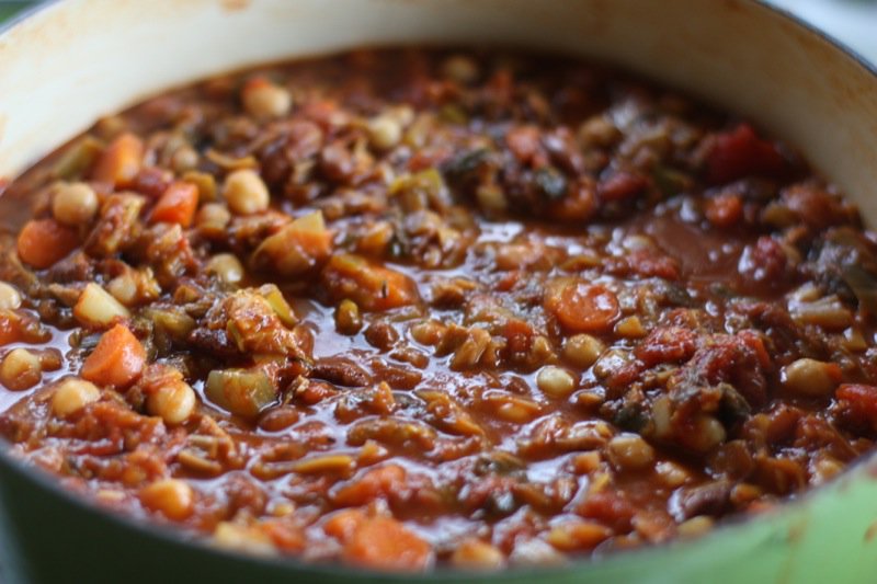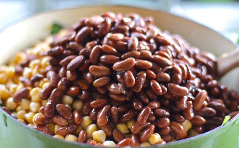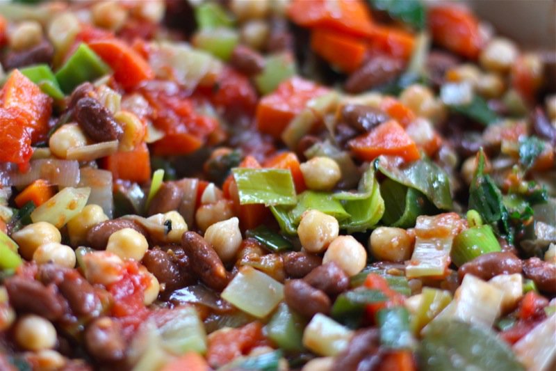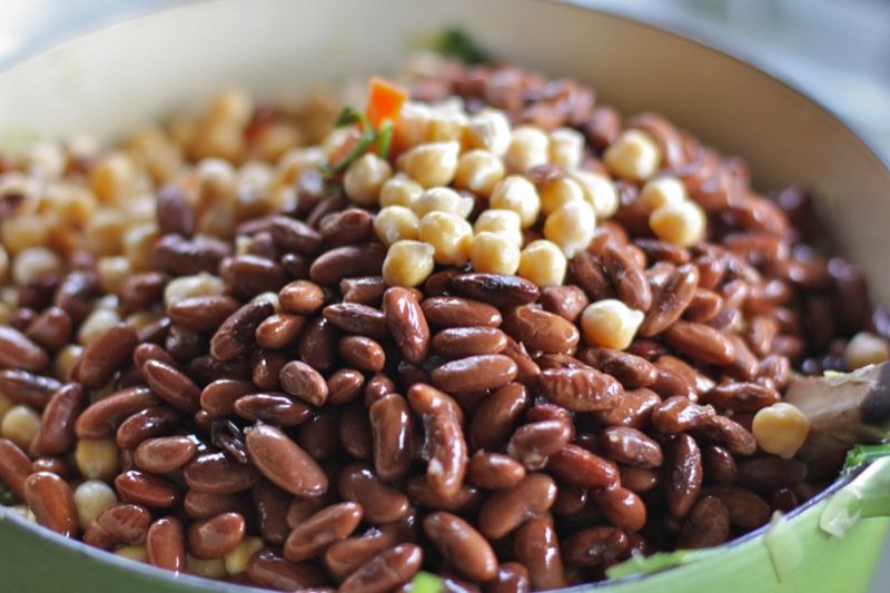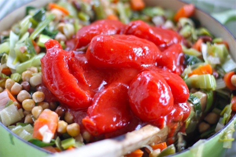 - 6 c Great Northern beans, rinsed and drained (I rehydrate my own the night prior, and cook separately without salt to desired doneness; this time I used what beans I had available through Live Local from Vauxhall Seeds: chick peas and Cannellini beans are)