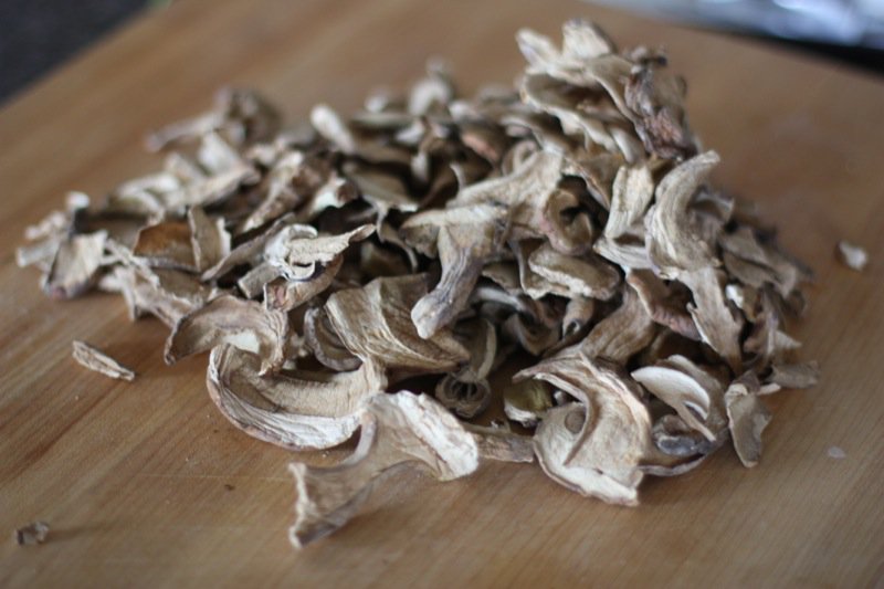 - 1 ounce dried porcini mushrooms soaked in 1 cup of boiling water (Mo-na Foods)