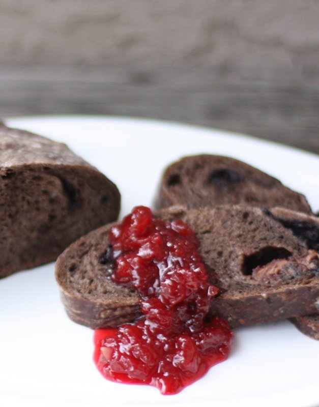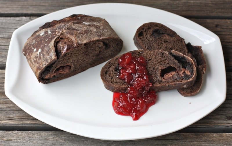 The sought after decadent hand shaped Bernard Callebaut chocolate bread that Valerie had raved about was on the shelf. I didn’t need coaxing. Before I had it home I was already imagining its combination with my Evans Cherry Jam. And, making chocolate bread pudding. That will have to be next time; however, as there was just not enough!
