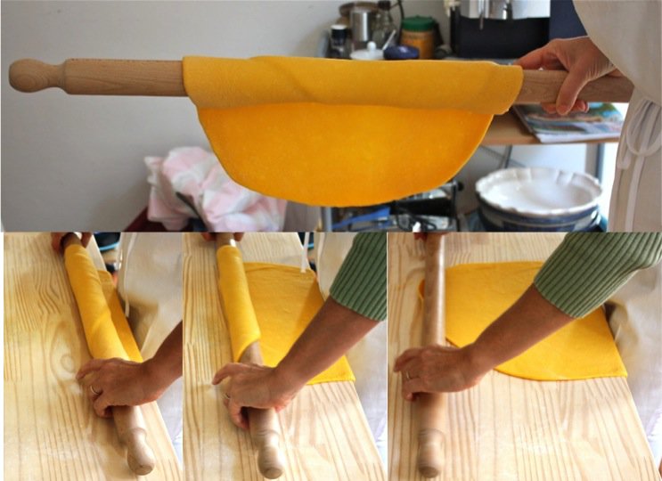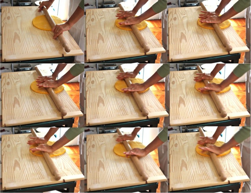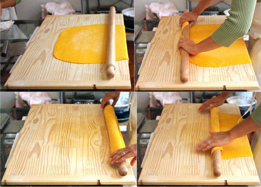 - Place the pin near the edge and use one hand only, if necessary, or two, but distribute the pressure on each hand according to the need of the pasta. Work through ensuring your edges are as flat and thin as the body of the sheet. If the piece is too big, cut it and move ½ and work with only ½.