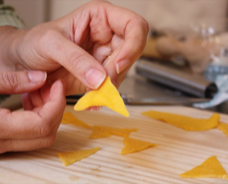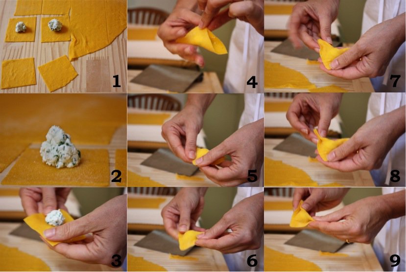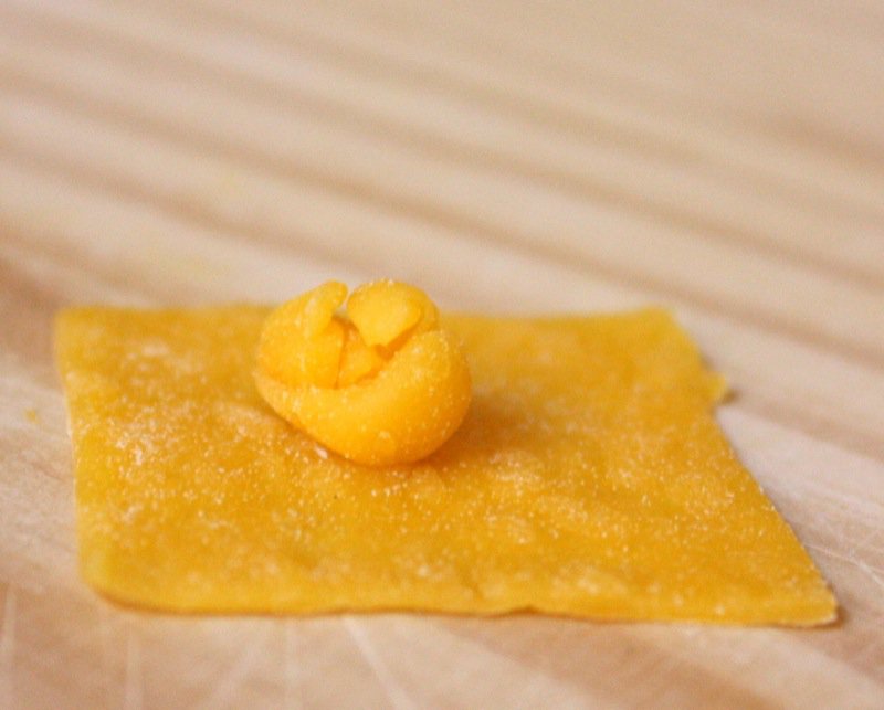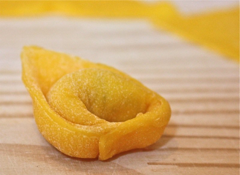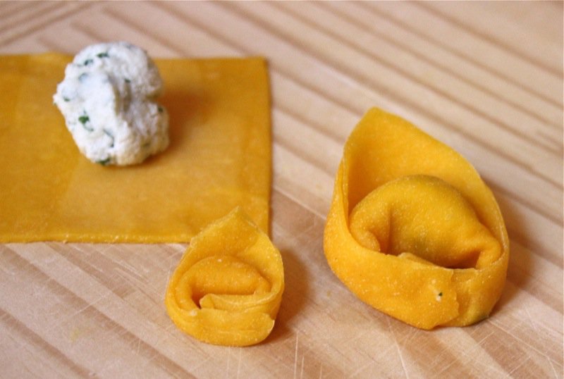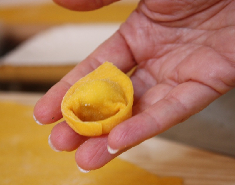 Interestingly, what we call Tortellini in North America is actually tortelloni. Tortellini is a true specialty as it is so very tiny and incredibly labour intensive to make. Below, Mirabel demonstrates the difference between tortellini and torelloni using a little ball of pasta dough as the filling for the tortellini. You can see the difference in the size of the square and understand why these are such a labour of love!