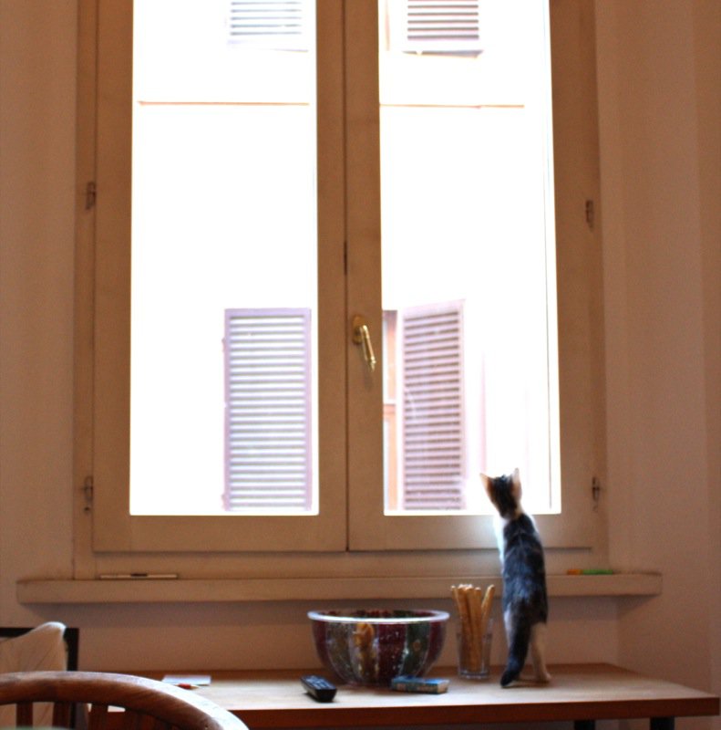 Let’s reset the stage: down the back hall of Martina’s magificent 2000 square foot palatial apartment steps away from the Piaza Maggiore in Bologna, and into the kitchen on the left, opposite the arched window. Kitty is propped on the counter tracking a black fly on outer glass pane.