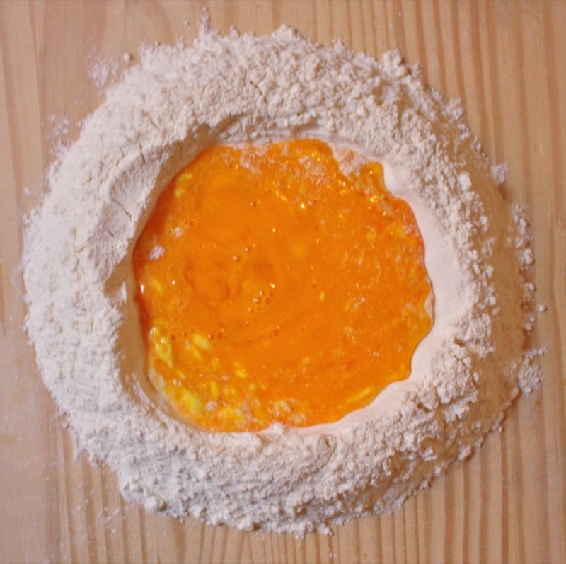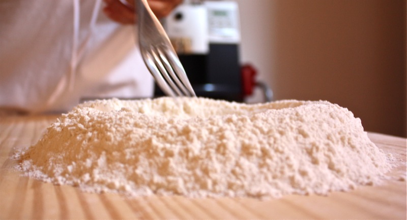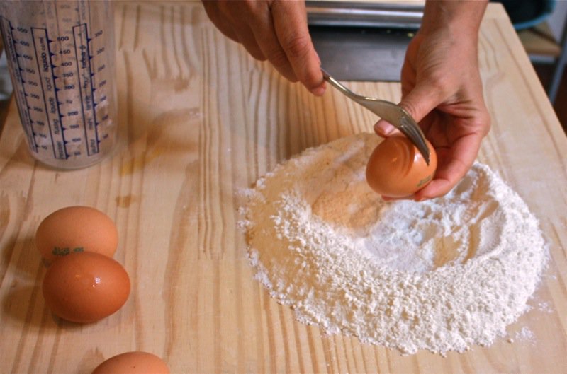 There are two factors to consider when determining how much flour to incorporate into the eggs: the weather and the weight of the eggs. These will always vary, thus the exact amount of flour used each time will also vary. Pay close attention to the texture of the dough and leave out or add more flour as required.