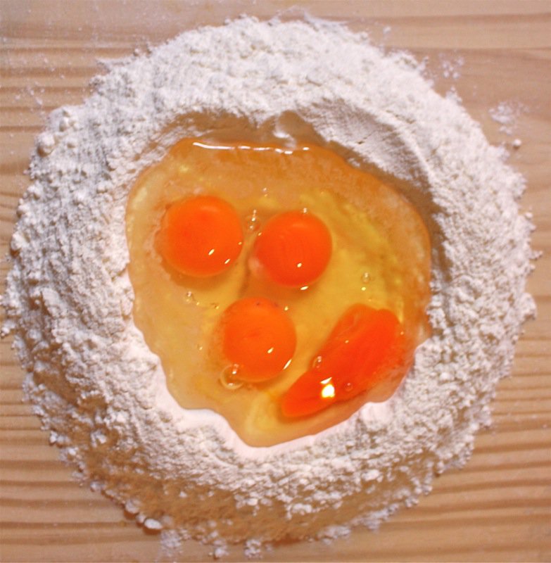 Place the tips of your fingers with your thumb to make a volcano opening, or a well, in the flour; push it back carefully and slowly to ensure enough space for the amount of eggs you are using. Wash and dry the eggs in their shells. Break the clean eggs into the well.