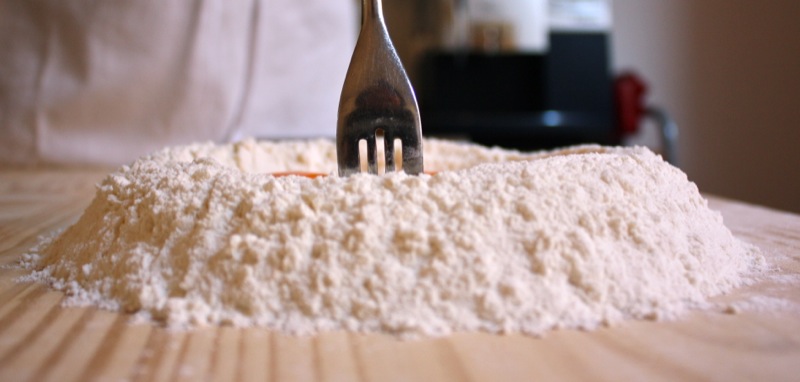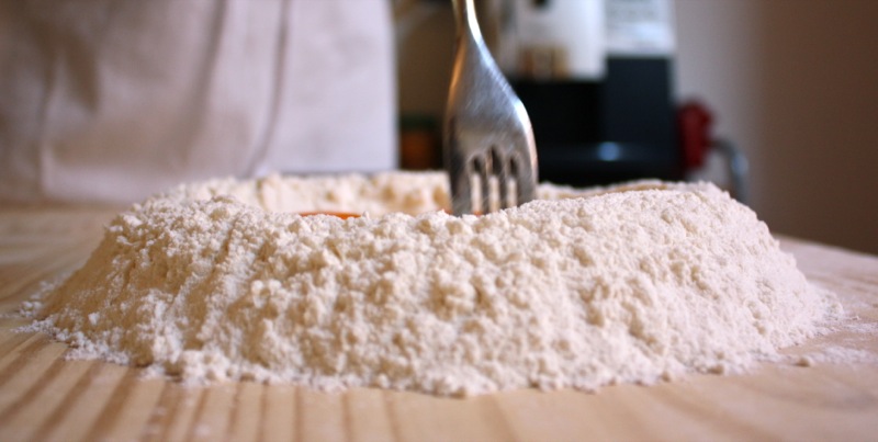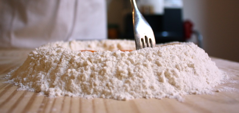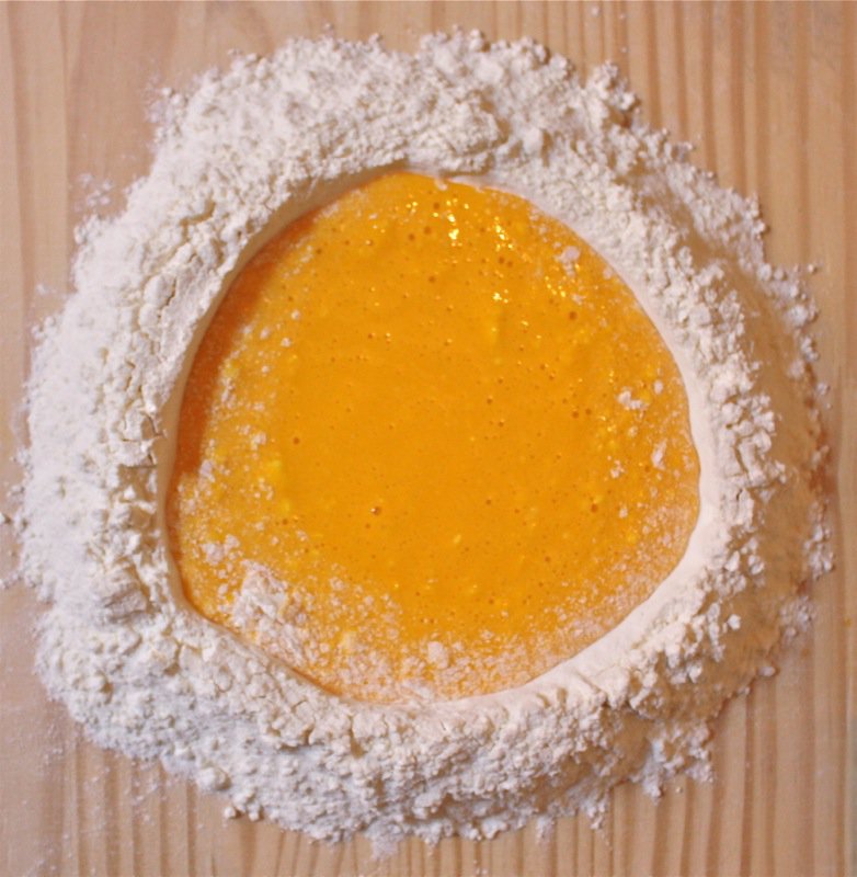 Above, see how the fork was used to widen the flour well and heighten the walls to enable the eggs and flour to be carefully incorporated without breaking through the flour wall. (Compare the photo directly above to the one above it.) Using a fork, slowly mix the eggs together. There is no rush. Mix, or whip, the eggs until completely combined and then slowly, slowly, slowly incorporate a little flour as you stir. Fully incorporate each new addition of flour before you introduce more into the mix.
